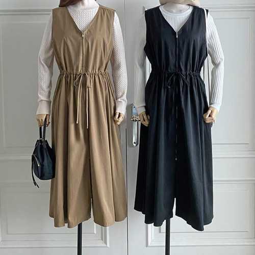 옷자락 / 여성 무지 허리스트랩 브이넥 지퍼 나시 롱 원피스