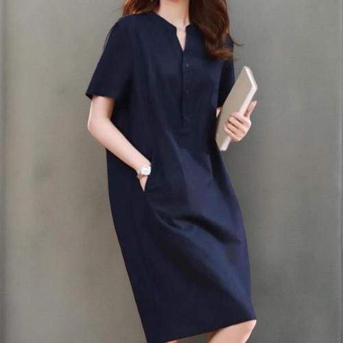[신상오픈런]여성 무지 브이넥 반팔 미디 원피스 단추 디자인 (38283945)