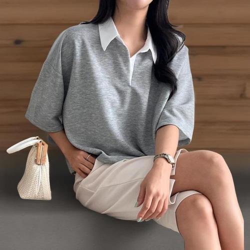 [신상오픈런]여성 오버핏 배색 카라 반팔 크롭 티셔츠 무지 디자인 (36340876)