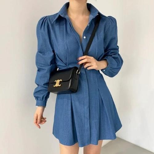 [신상오픈런]여자 무지컬러 핀턱 셔링 맞주름 카라넥 미니 원피스 (41032925)