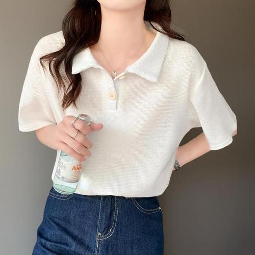 [신상오픈런]여성 무지컬러 와플 패턴 버튼 카라 반팔 티셔츠 (35333531)