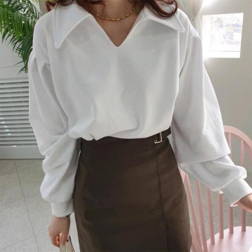 [옷자락]여자 퍼프 긴팔 피케 무지 V넥 티셔츠