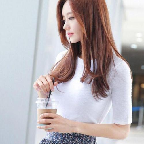 [에이치플러스몰]여자 기본 면티 크롭 반팔 티셔츠 U넥 스판 실켓 무지 5부 반팔티