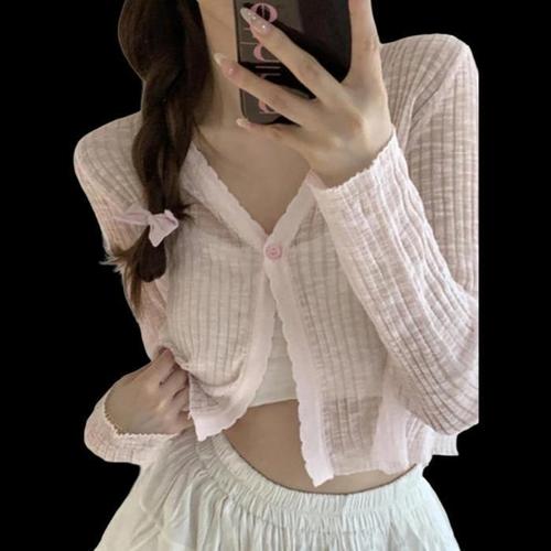 쪼예 러블리 물결 프릴 리본 골지 크롭 긴팔 가디건