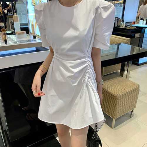 슈팅스타 / 라운드넥 퍼프소매 슬림 주름 미니기장 원피스 820645