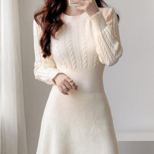 마쿠쿠 라운드넥 긴팔 여성 케이블 꽈배기 A라인 미니 니트 원피스