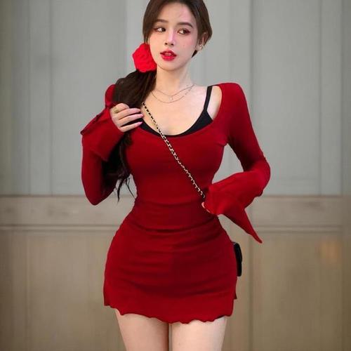 [신상오픈런]여성용 레드 유넥 니트 레이어드 미니 원피스 이너탑 (41266581)