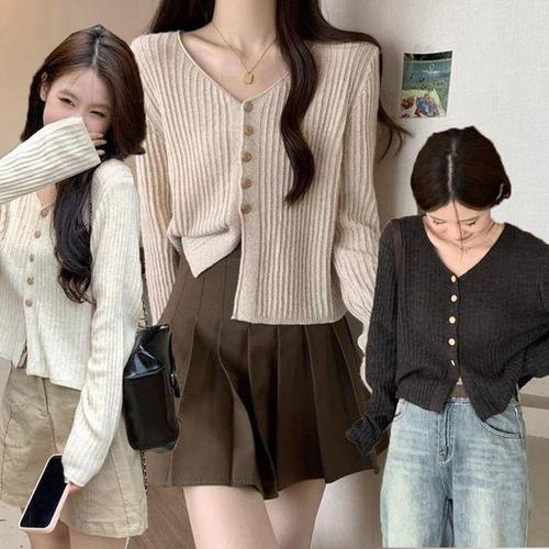 [에이치플러스몰]여성 골드버튼 세련된무드 간절기 봄 여름 가을 세미크롭 미니멀 골지 가디건