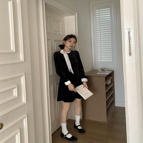 [오너클랜]인기상품 여성 하객룩 리본 타이 원피스 벨벳 배색 정장 블랙 미니드레스 [WFJLX1P_251119]