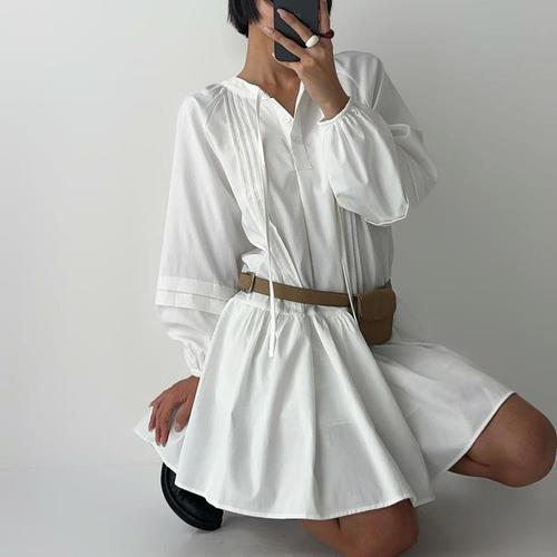 [신상오픈런]여성 타이 헨리넥 퍼프 소매 핀턱 플레어 가을 미니 드레스 (40734317)