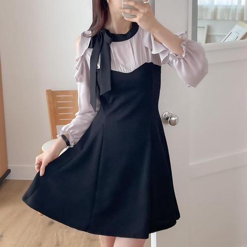 [신상오픈런]컷아웃 긴팔 투톤 프린세스라인 리본타이 미니원피스 (31986231)