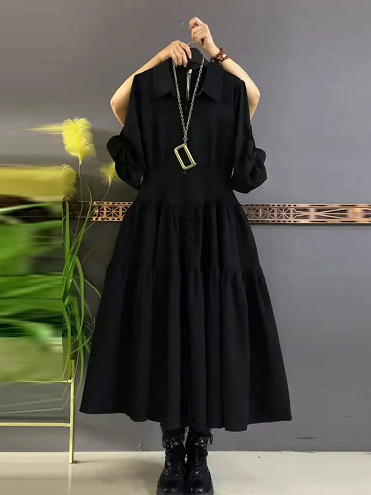 플러스 사이즈 롱 허리 조절 칼라 드레스 트렌디한 통근 스타일 슬리밍 블랙 스커트 플러스 사이즈 여성용 한국식 스트레이트 컷
