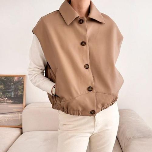 [신상오픈런]가죽조끼 페이크레더 미시룩 허리셔링 드롭숄더 카라넥 (30433774)