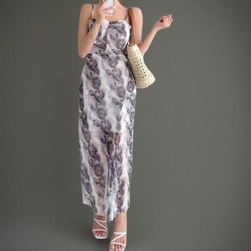 [신상오픈런]여성 시스루 플라워 패턴 쉬폰 롱 나시 원피스 러플 디자인 (38767291)