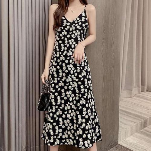 홍언목요 여성 미디원피스 끈나시 원피스 레이어드 플라워 언밸런스 A라인 원피스 바캉스룩