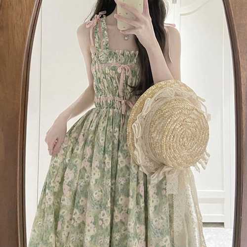 슈팅스타 / 그린 뷔스티에 플로럴 플라워패턴 끈나시 롱 원피스
