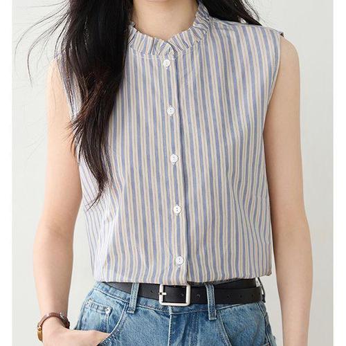 여성 민소매 스트라이프 카라 셔츠 블라우스 오피스룩 (WFHVSQ8)