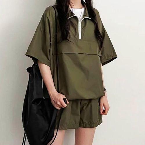[신상오픈런]여자 힙무드 바스락 하이넥 반팔 집업 반바지 세트
