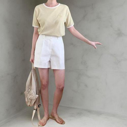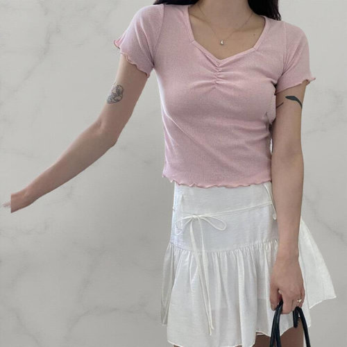 [다잇템]여성 V넥 반소매 바스트 프릴 면혼합 티셔츠