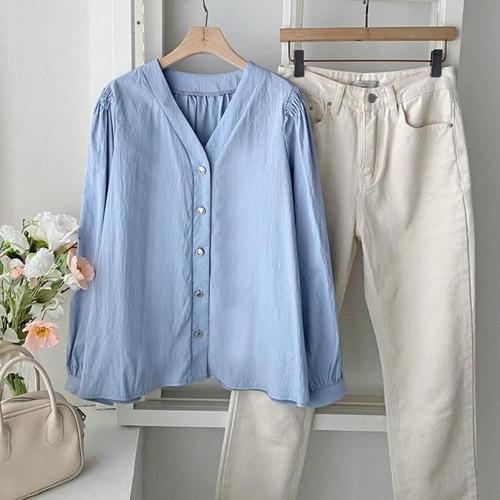 [신상오픈런]와이넥셔츠 잔셔링 봄남방 바스락 소라색블라우스 (30100368)