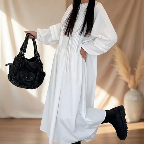 [옷자락] 여성 핀턱 리본 라운드넥 나그랑 롱박시 원피스