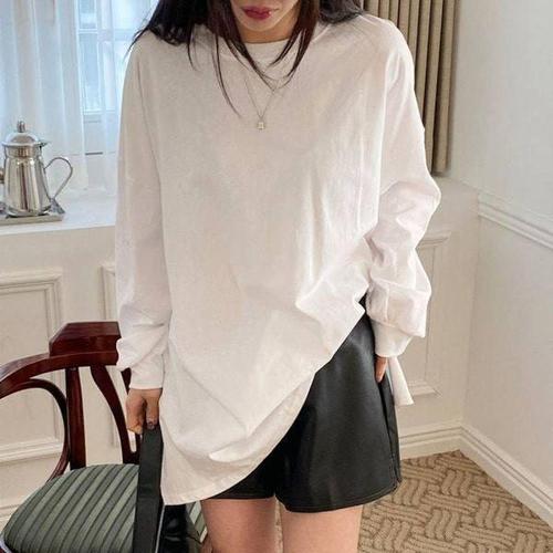 [샵앤][샵앤] 국산 여성 라운드 박시 루즈핏 세미크롭 반팔 티셔츠 DAI-WSH-20768-화이트