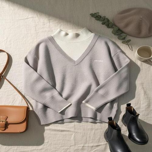 [신상오픈런]여성 자수 디자인 레이어드 반목 긴팔 오버핏 니트 (42613327)