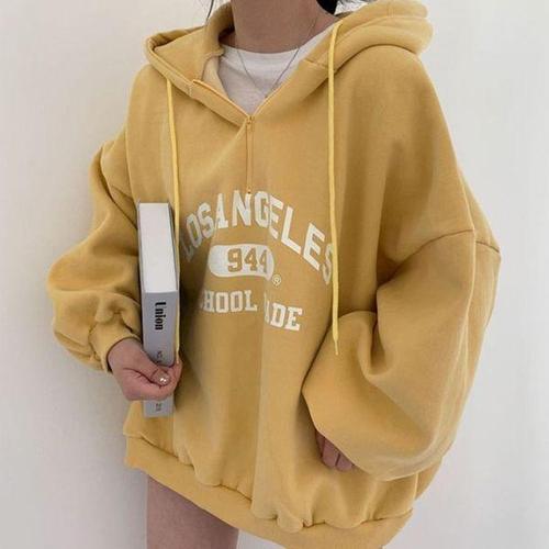 [에이치플러스몰]여성 루즈핏 반집업 로고 후드티셔츠 2컬러 캐주얼룩