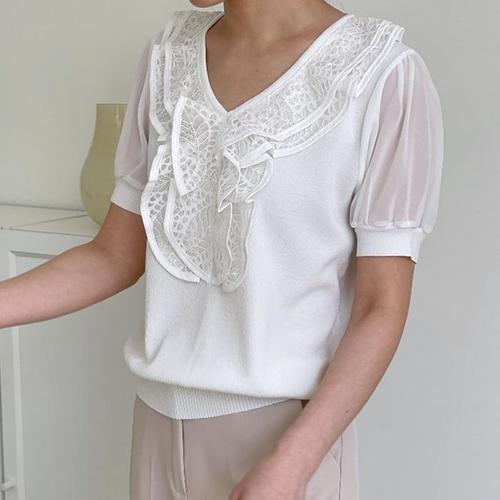 [신상오픈런]레이스 러플 브이넥 기본핏 시보리 반팔니트 봄티셔츠 (31989964)