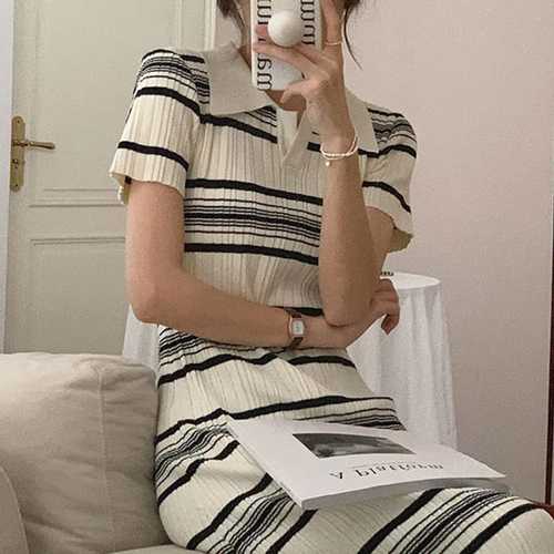 슈팅스타 / 카라넥 스트라이프 슬림 반팔 니트 원피스 230749