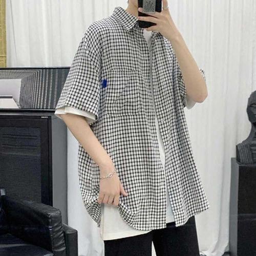 [에이치플러스몰]티셔츠 카라 체크 반팔 남자 여름 레이어드 꾸안꾸룩