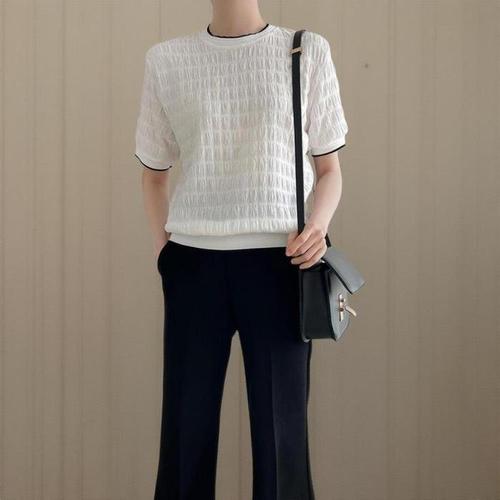 [신상오픈런]여성 여름 반팔 티셔츠 링거넥 라운드 엠보 블라우스 출근 패션 (38641746)
