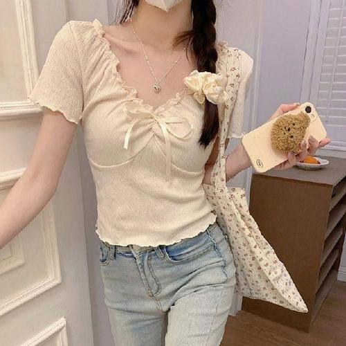 [에이치플러스몰]리본 반팔 여자 상의 크롭 여성 여름 반팔티 블라우스