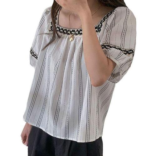 [에이치플러스몰]넥자수 반팔블라우스 캐주얼 새틴블라우스티