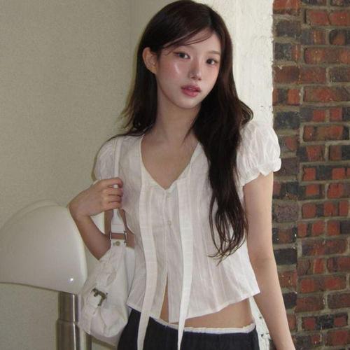 로엘란 뒷리본 스퀘어넥 퍼프소매 크롭 블라우스 R-C70