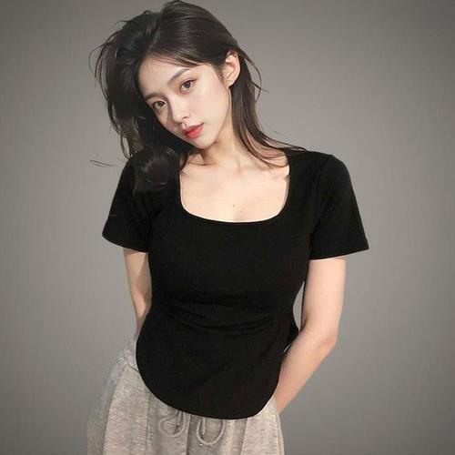 [신상오픈런]여성 슬림핏 스퀘어넥 반팔티셔츠 둥근밑단 (38169776)