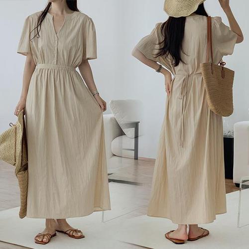 [드리다]여름 바스락 카라 브이넥 플레어 빅사이즈 반팔 롱 원피스