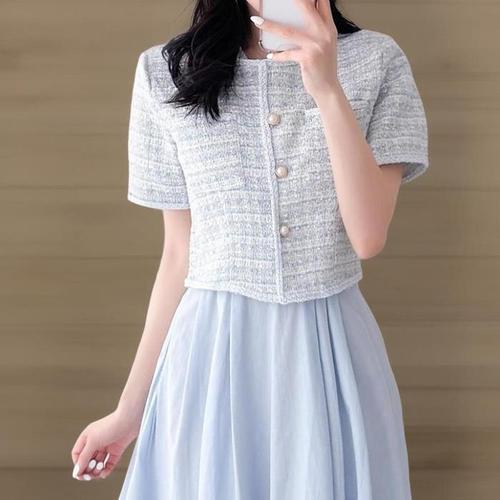 [의류] 진주 버튼 트위드 크롭 반팔 자켓 여름 하객룩 데일리 아우터