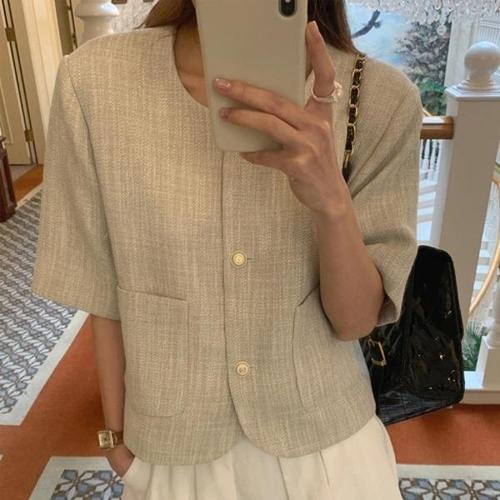[다잇템][다잇템] 여자 카라없는 SS 반소매 V넥 플랩 주머니 트위드 자켓_12925798_588872