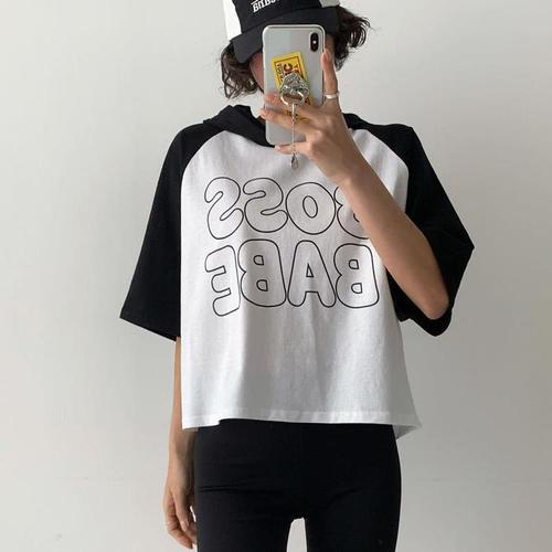 [신상오픈런]투톤 반소매 키치 레터링 후드티셔츠 봄스웨트셔츠 (31637080)