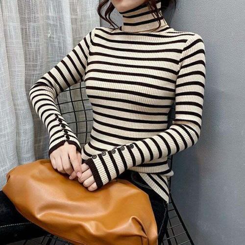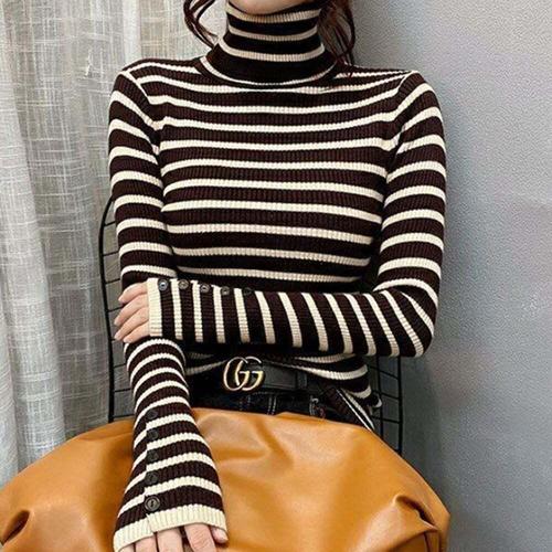 [셀럽하우스]스트라이프 VRTY8813 소매 포인트 골지니트 목폴라 티셔츠