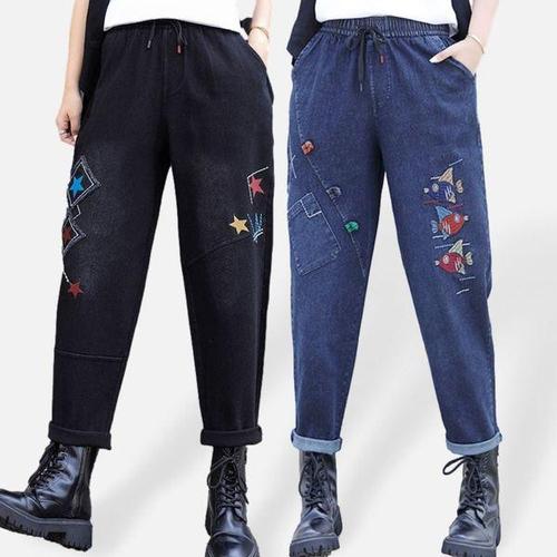 [103st] 여성 배기핏 융기모 본딩 몽키 캐릭터 자수 밴딩 스판 겨울 청바지 진청