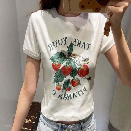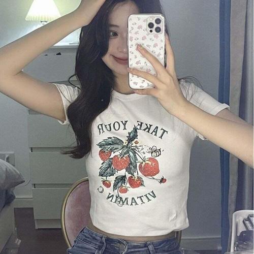 [셀럽하우스]여성 TYDQ6105 딸기 프린팅 크롭티 면 반팔 티셔츠 배꼽티