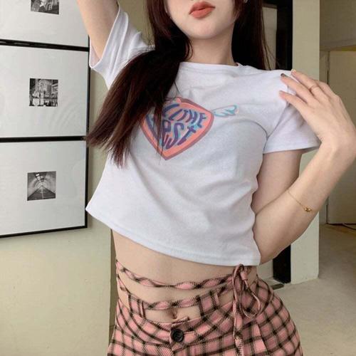 [셀럽하우스]여자 ZEFV3782 크롭 반팔티 러블리 프린팅 면 티셔츠 배꼽티