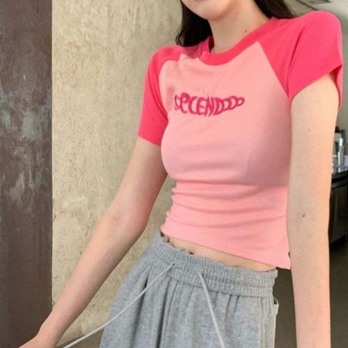 반팔 크롭티 여성 배꼽티 Y2K 여름 배색 스타일
