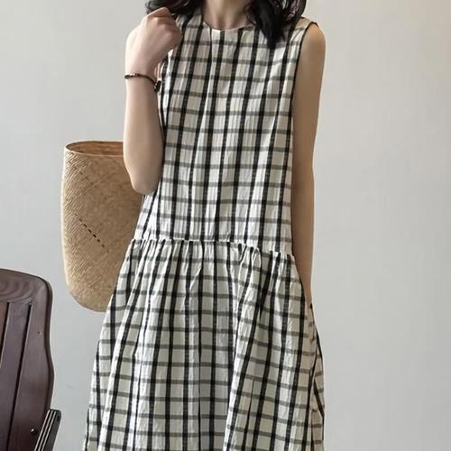 [디작소]체크패턴 배색 민소매 루즈핏 A라인 롱원피스 (39781155)