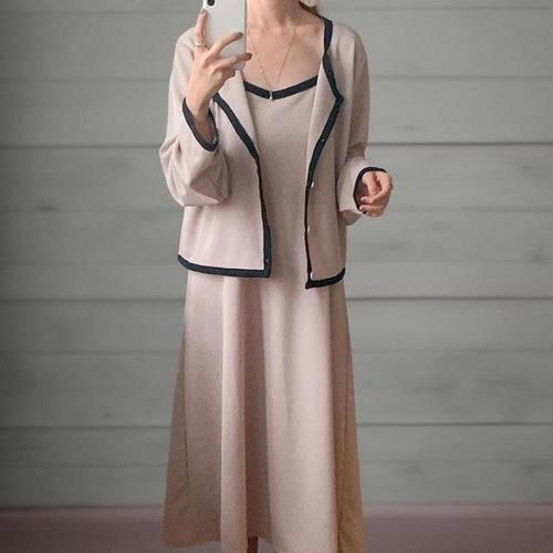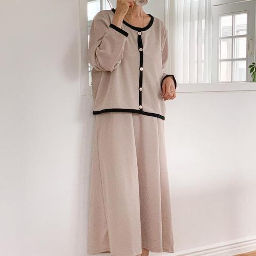 [신상오픈런]여성 배색 라운드넥 가디건과 끈 나시 롱원피스 세트 (41502933)
