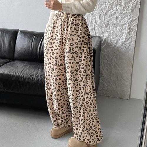 [옷자락]여자 기모와이드 투웨이 스트링 밴딩 레오파드 바지