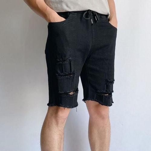 [에이치플러스몰]남자 와이드핏 흑청 데님 스타일 밴딩 스트링 반바지