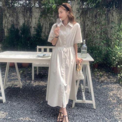 [에이치플러스몰]롱 원피스 카라 밴딩 플레어 셔츠 여성 롱원피스